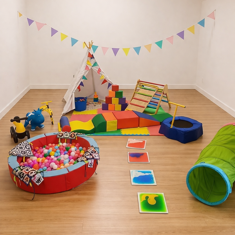 Includes soft play blocks, ball pool, slide, tent, toys, ride ons, hoppers, sensory stepping squares.